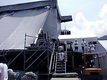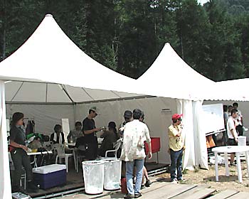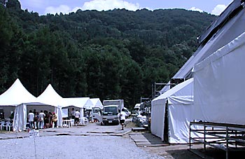 左側に並ぶのは 控え室代わりのテント 右側がステージ